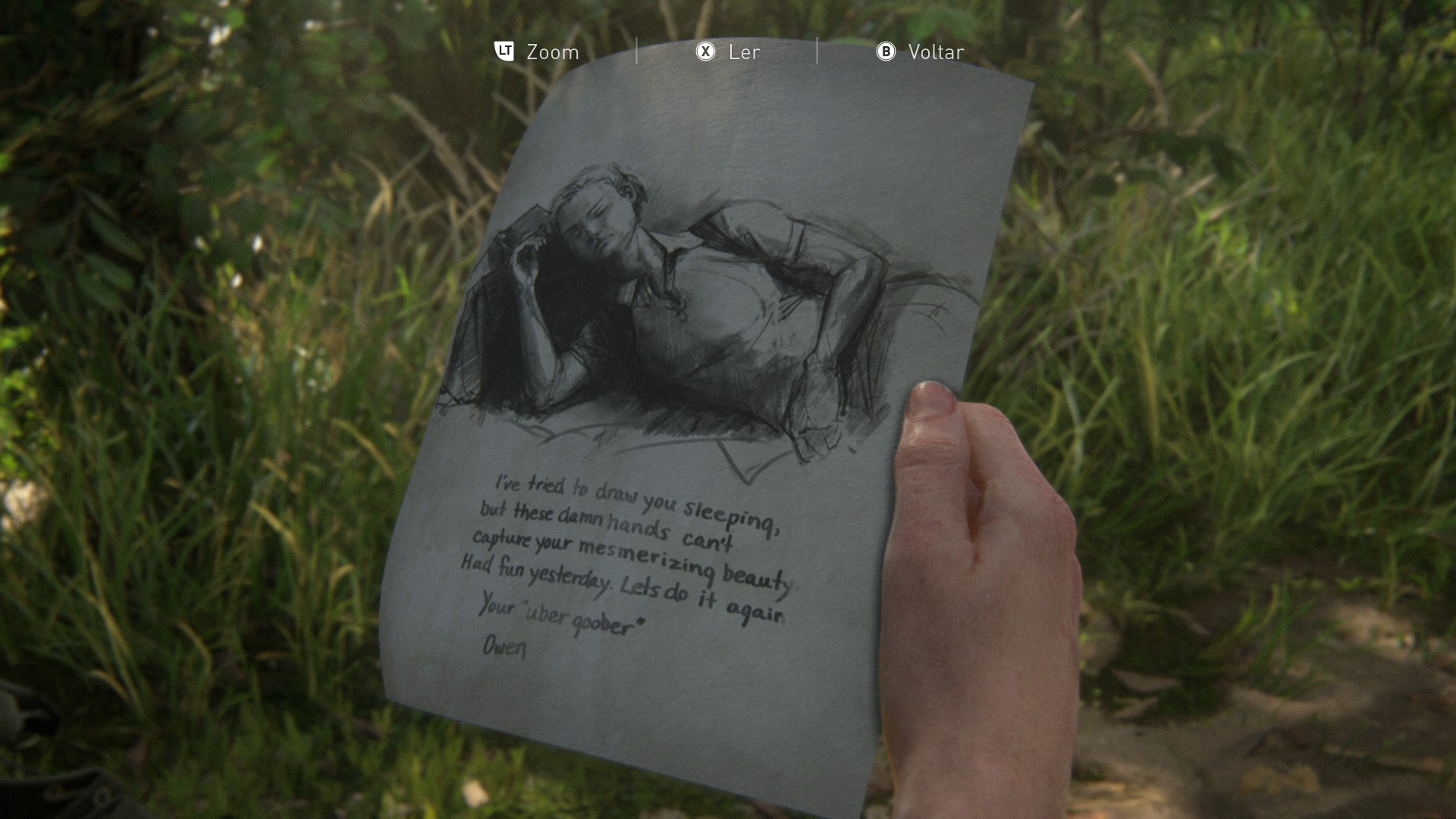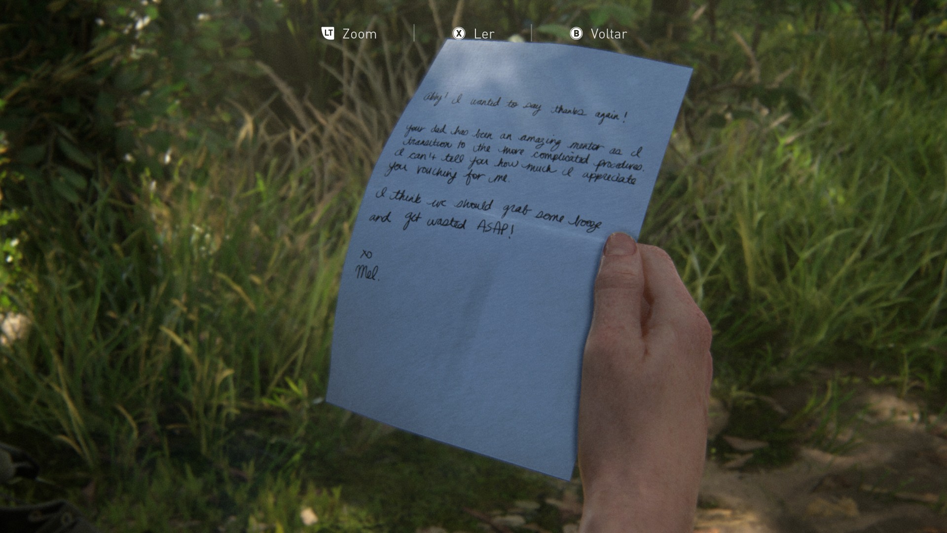 Neste trecho, você assume o controle de Abby em um flashback de quatro anos atrás. Ao abrir sua mochila desde o início, é possível ver que dois artefatos já estão no inventário: o Cartão de Agradecimento da Mel e o Desenho da Abby feito pelo Owen. Isso significa que há apenas um artefato adicional a ser encontrado ao longo da fase.