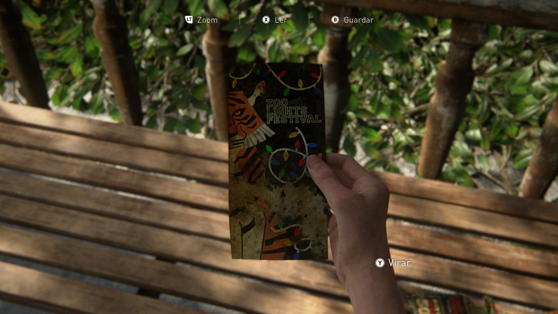 Na área seguinte, com construções ao redor, vá para a direita, onde há um gazebo. Dentro dele, pegue o folheto de férias do zoológico, que é o último artefato do capítulo.