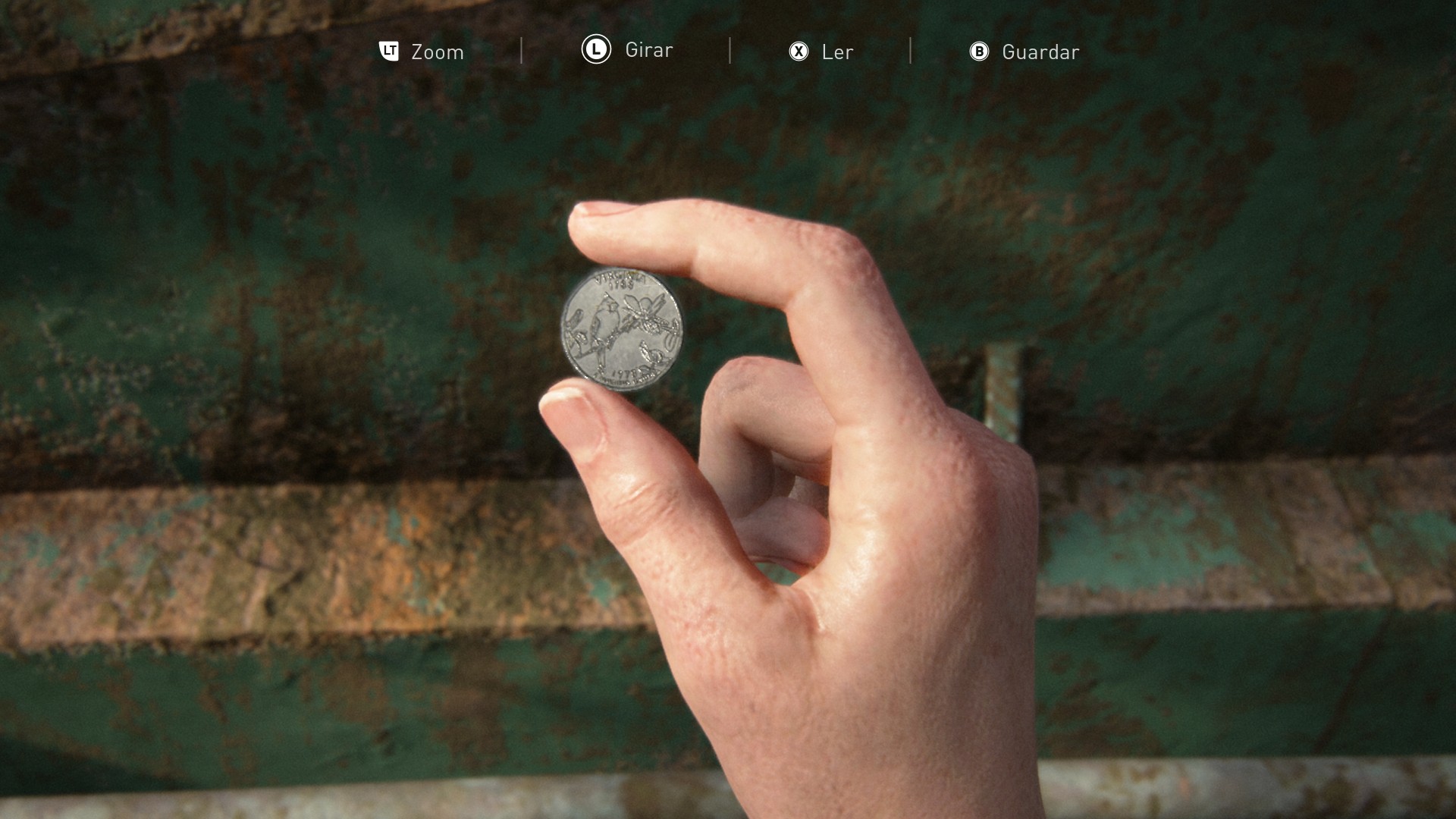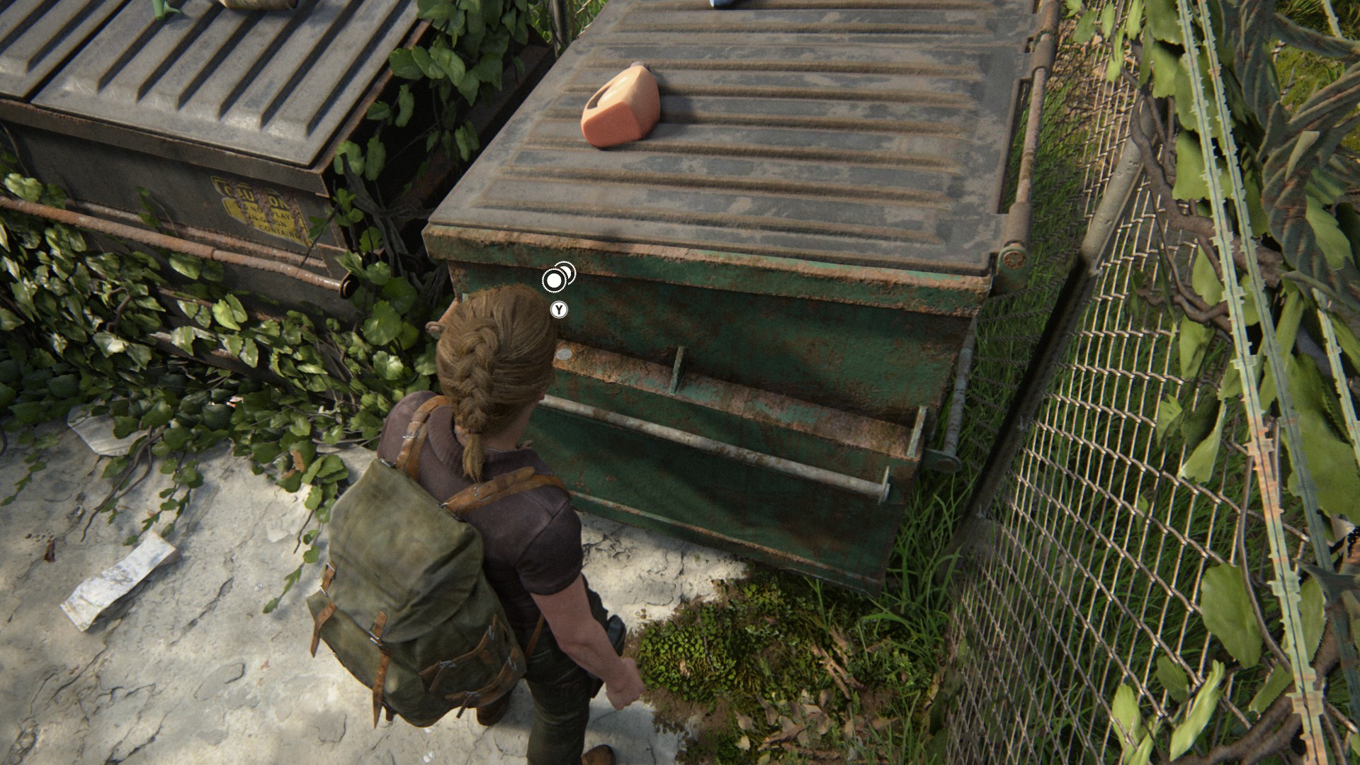 Pule pela janela quebrada e vá até a caçamba no canto. Interaja com ela para coletar a moeda da Virgínia, localizada no topo. Essa moeda é obrigatória para o progresso, portanto não pode ser perdida.